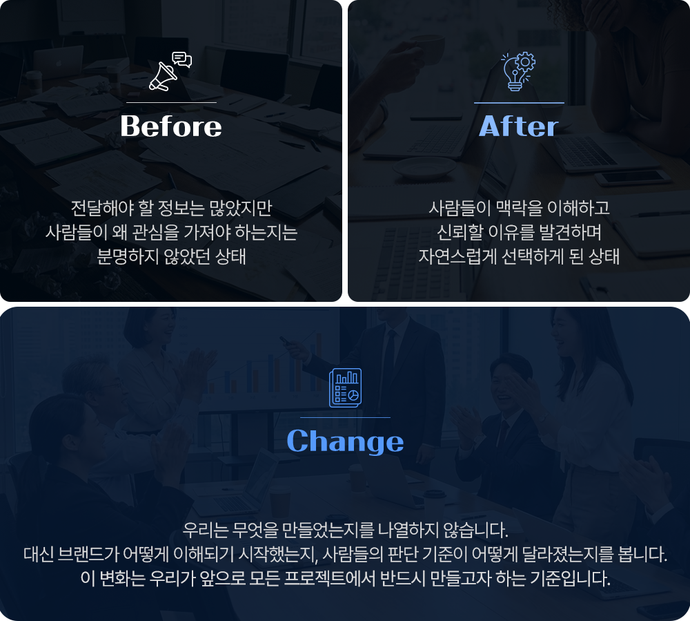 우리는 사람들이 브랜드를 이해하고, 판단하고, 선택하게 되는 이유의 구조를 설계합니다